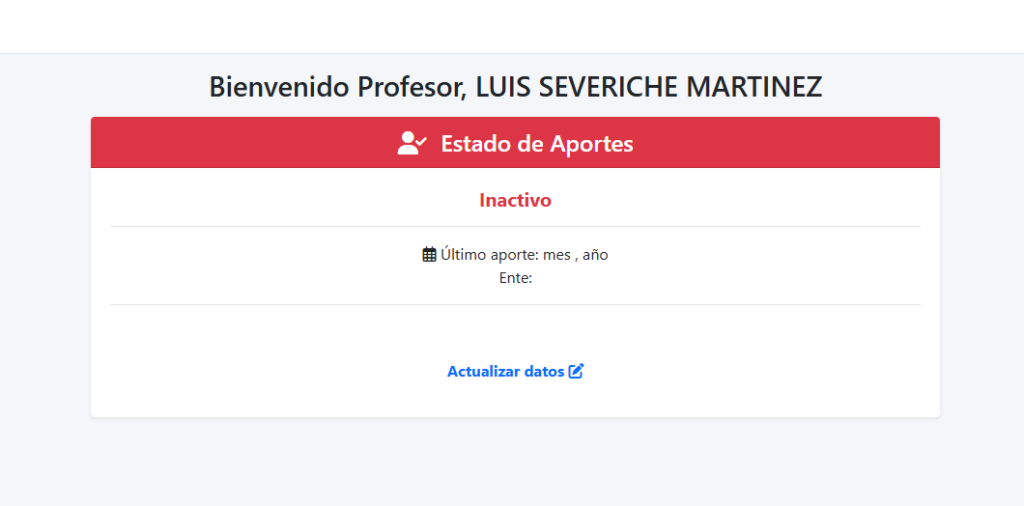 5. Una vez estes dentro vas a ver tu status, activo o inactivo, fecha de tu ultimo aporte y podras dar click en el boton actualizar datos...