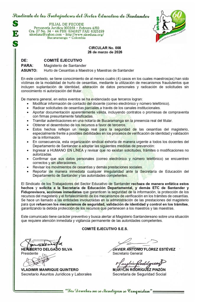 El Comité Ejecutivo del SES informa a la comunidad docente que se han detectado al menos cuatro (4) casos graves de hurto de cesantías en el departamento.