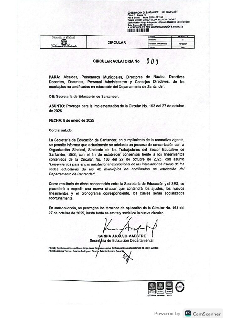 La Secretaría de Educación Departamental ha emitido la Circular Aclaratoria 003, mediante la cual se prorrogan los términos de la Circular 163 del 27 de octubre de 2025