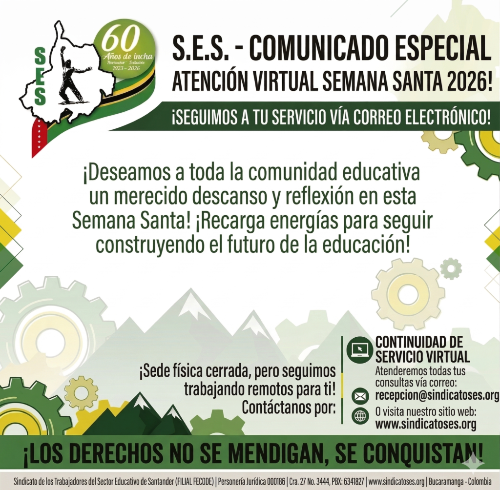 En el marco de la Semana Santa 2026, el Sindicato de los Trabajadores del Sector Educativo de Santander (SES) envía un saludo de reflexión y descanso a todos sus miembros. Es momento de recargar energías para seguir construyendo juntos el futuro de la educación.