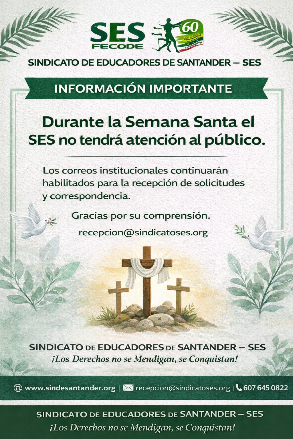 En el marco de la Semana Santa 2026, el Sindicato de los Trabajadores del Sector Educativo de Santander (SES) envía un saludo de reflexión y descanso a todos sus miembros. Es momento de recargar energías para seguir construyendo juntos el futuro de la educación.