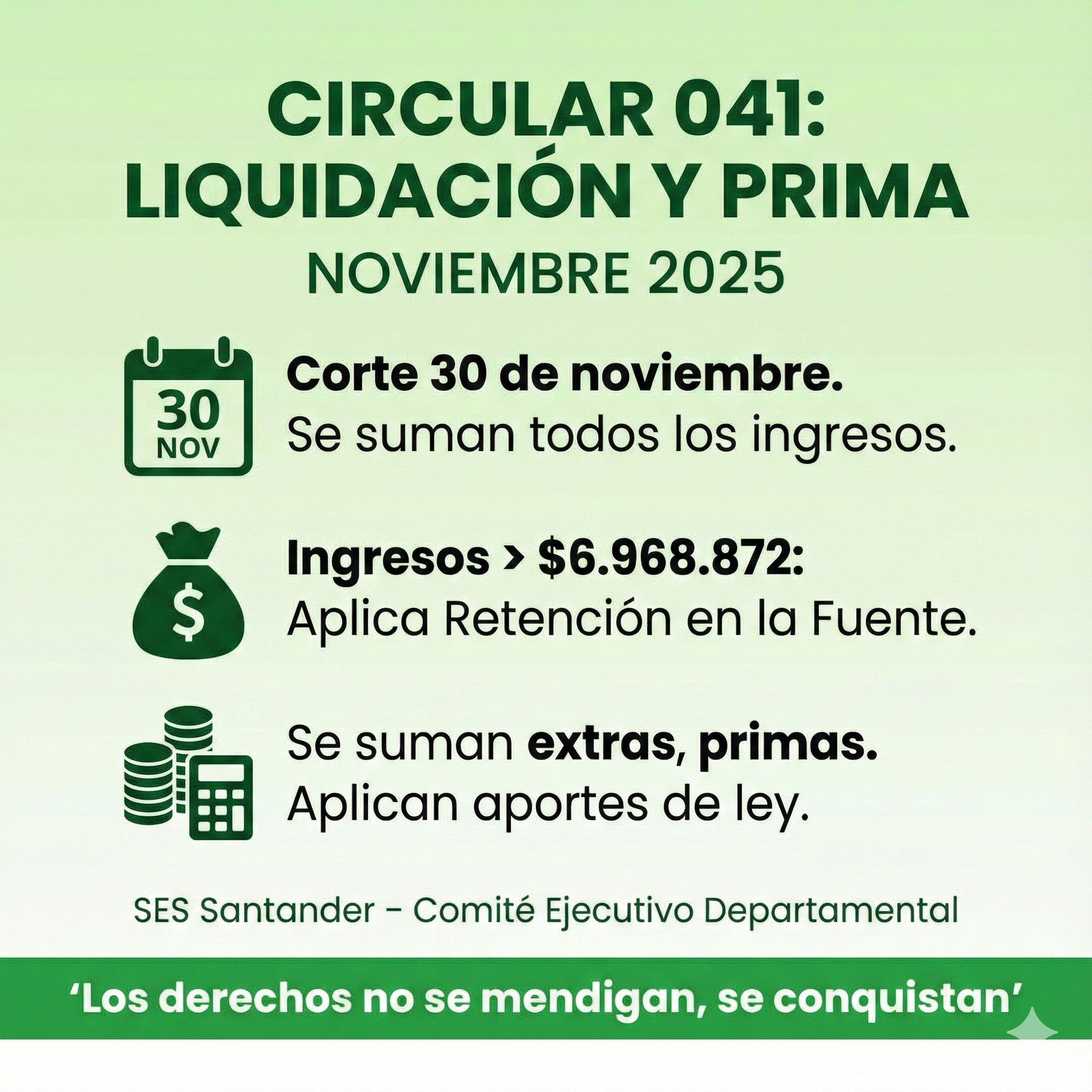 El Sindicato de Educadores de Santander informa a todos los afiliados las orientaciones sobre la liquidación del salario del mes de noviembre de 2025 y de la Prima de Vacaciones.