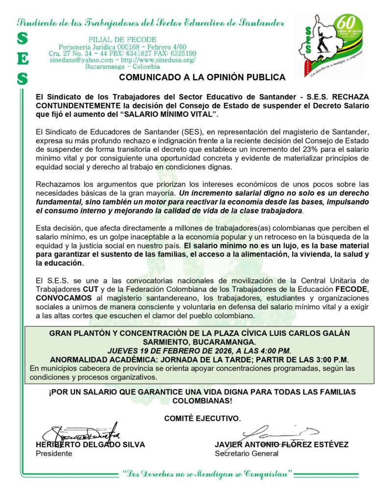 El magisterio de Santander se declara en alerta. El Sindicato de los Trabajadores del Sector Educativo de Santander (SES) manifiesta su profundo rechazo e indignación ante la decisión del Consejo de Estado de suspender de forma transitoria el decreto que fijaba un aumento del 23% para el «Salario Mínimo Vital».