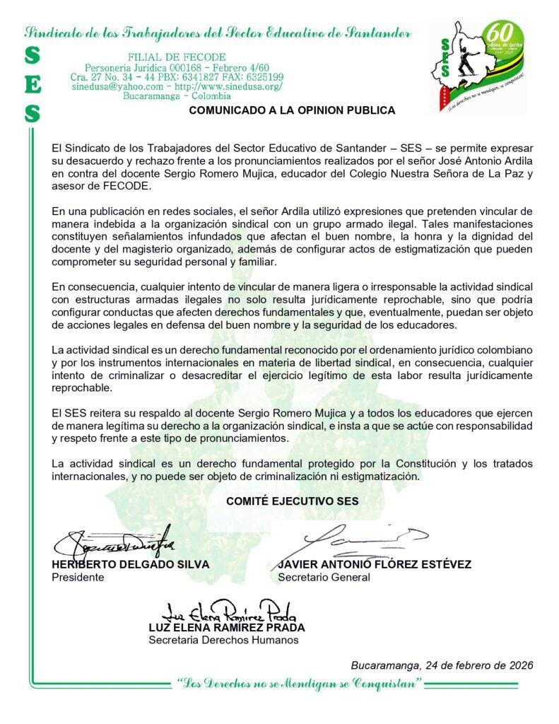 El Sindicato de los Trabajadores del Sector Educativo de Santander (SES), filial de FECODE, manifiesta ante la opinión pública su absoluto rechazo a las recientes declaraciones realizadas por el señor José Antonio Ardila. Estas manifestaciones pretenden vincular de forma irresponsable nuestra labor organizativa con estructuras armadas ilegales.+2