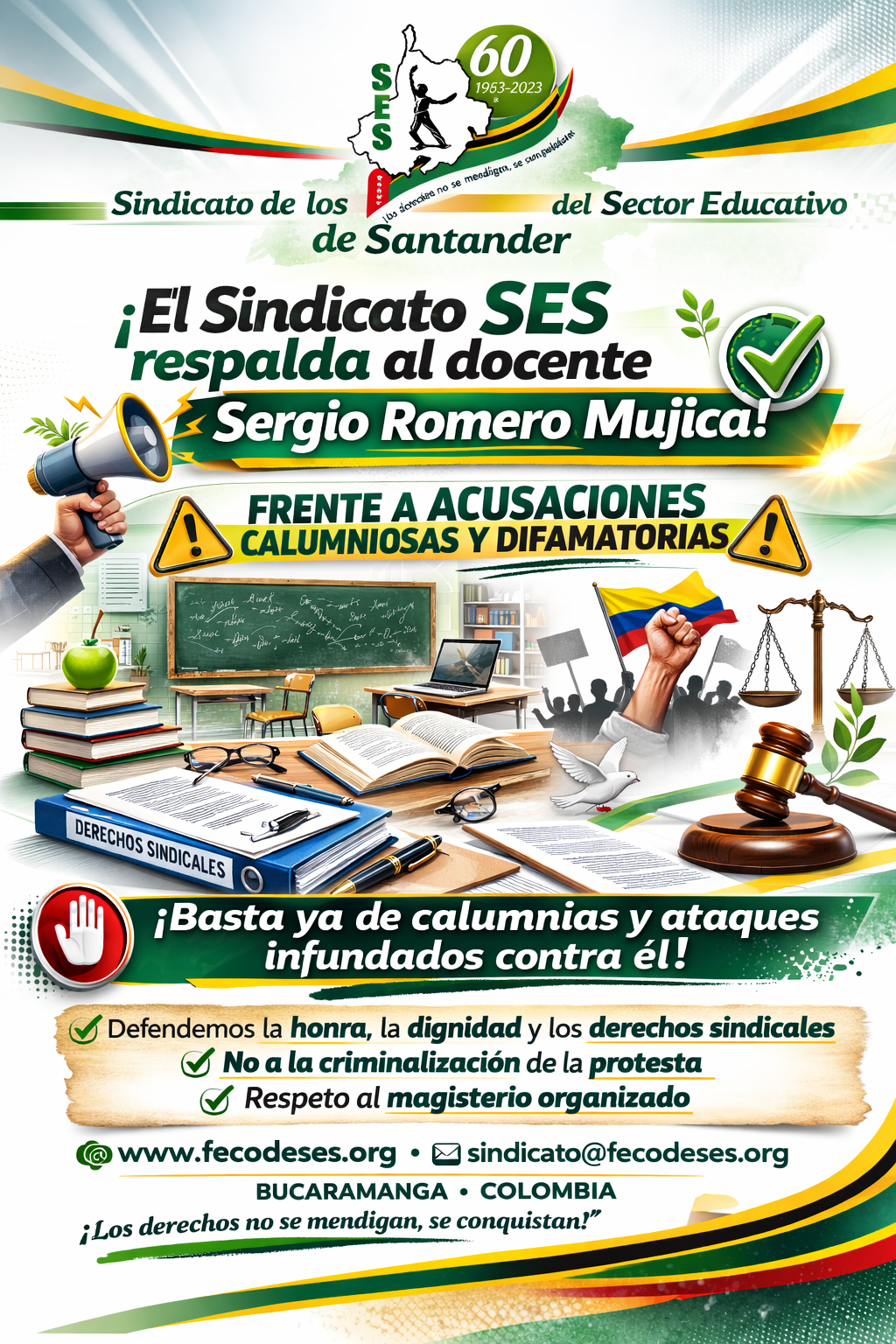 Defensa del Magisterio Organizado Los señalamientos afectan directamente al docente Sergio Romero Mujica, educador del Colegio Nuestra Señora de La Paz y asesor de FECODE. El SES denuncia que este tipo de publicaciones en redes sociales:
